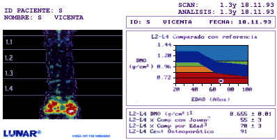 Vemos en esta gráfica que el asterisco negro, dentro del círculo blanco, que indica los valores obtenidos en la paciente, se encuentra actualmente dentro de la barra celeste; es decir en el rango normal, para personas de la misma edad, peso, sexo y raza. Al comenzar el tratamiento Vicenta S. presentaba una DMO de 0,655 gr/cm2 y 3 años y medio después la DMO es de 0,815 gr/cm2, es decir el 24,42% más del que tenía al inicio del tratamiento.