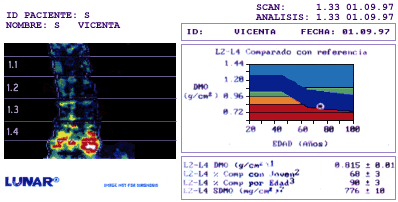 1/9/97, "La densitometría mineral ósea es de 0,815 gr/cm2 para la columna lumbar y corresponde al 90% de personas de su edad, peso, sexo y raza".